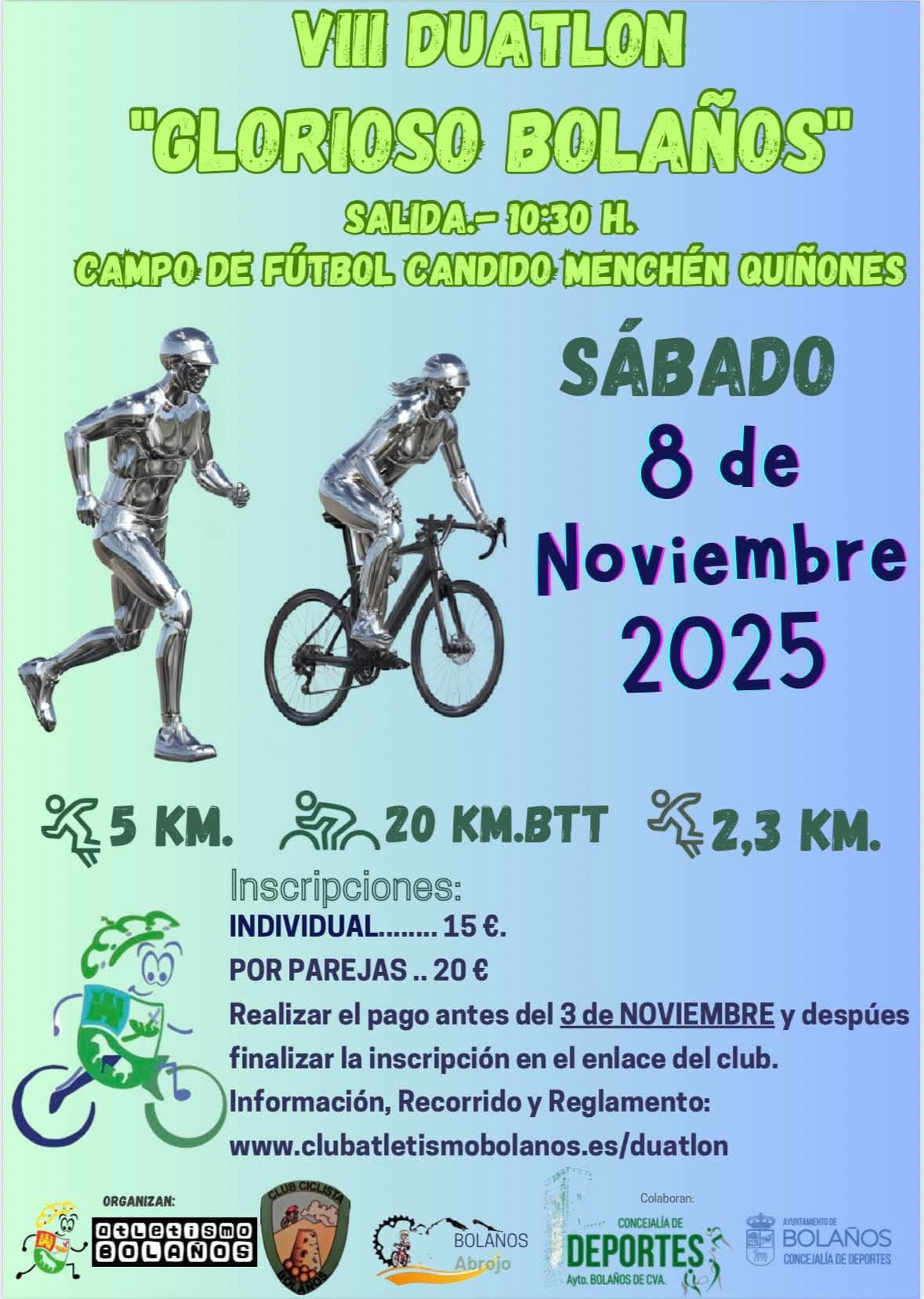 El Club Atletismo Bolaños organiza en colaboración con la Concejalía de Deportes del Ayuntamiento de Bolaños, Club Ciclista Bolaños y la Asociación BTT “El Abrojo”, una nueva edición del duatlón “Glorioso Bolaños”, que este año celebra su octava edición.