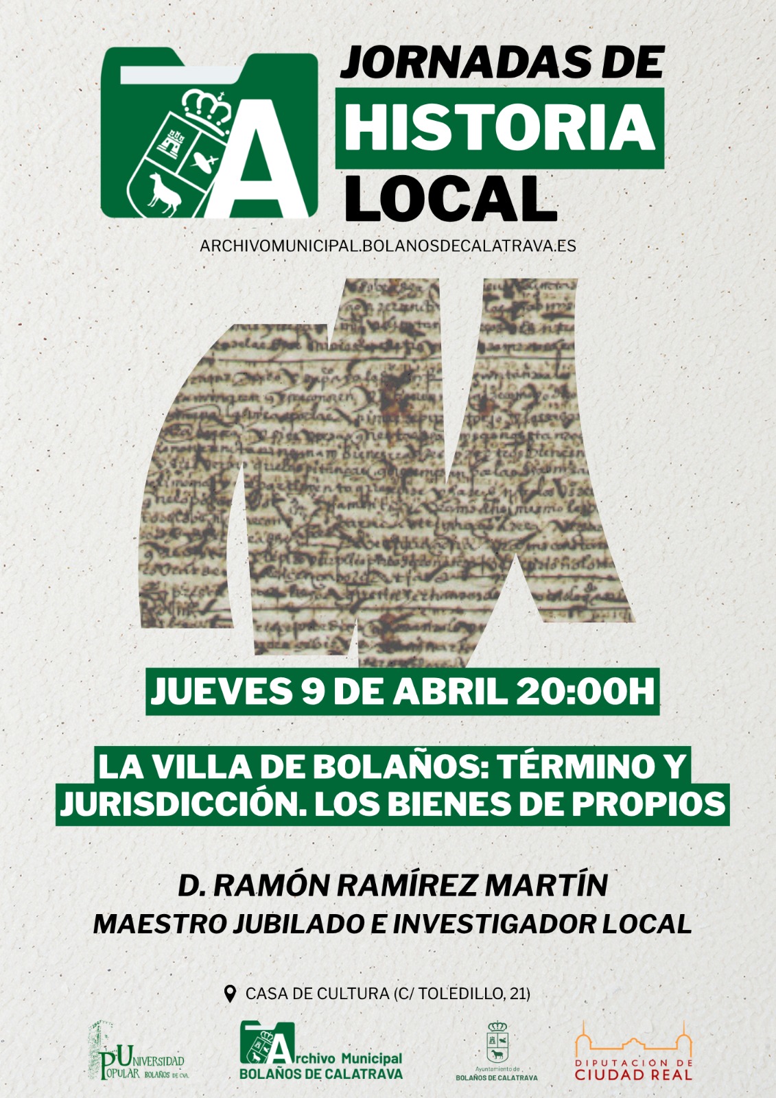 El Ayuntamiento de Bolaños, a través de su Archivo Municipal y en colaboración con la Universidad Popular, continúa su firme apuesta por la divulgación del pasado local. Este jueves, 9 de abril, la Casa de Cultura acogerá una nueva sesión de las Jornadas de Historia Local bajo el título: “La Villa de Bolaños: término, jurisdicción y bienes de propios”.