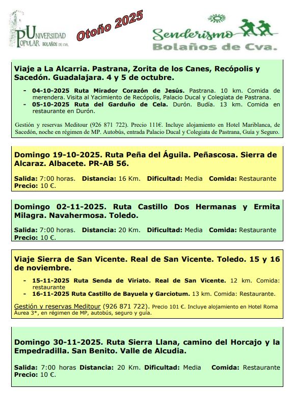 15 y 16 de noviembre: Sierra de San Vicente (Rutas Senda de Viriato y Castillo de Bayuela y Garciotum, 25 km en total). El coste es de 111 euros, incluyendo transporte, alojamiento en media pensión, guía y entradas culturales. Todo ello gestionado por Meditour.