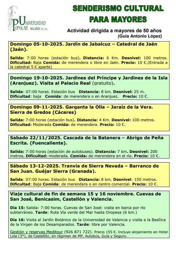 Desde la Universidad Popular se explica que con el objetivo de garantizar una correcta organización y disfrute de las actividades programadas, las rutas de senderismo y visitas culturales estarán dirigidas exclusivamente a personas mayores de 50 años.