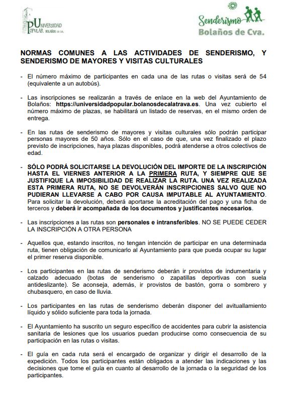 Las inscripciones se realizarán hasta completar las plazas disponibles. Las devoluciones de inscripción solo podrán solicitarse hasta el viernes anterior a la primera ruta, con la debida justificación. Tras la primera actividad, no se realizarán devoluciones, salvo si la actividad no puede llevarse a cabo por causas imputables al Ayuntamiento.
