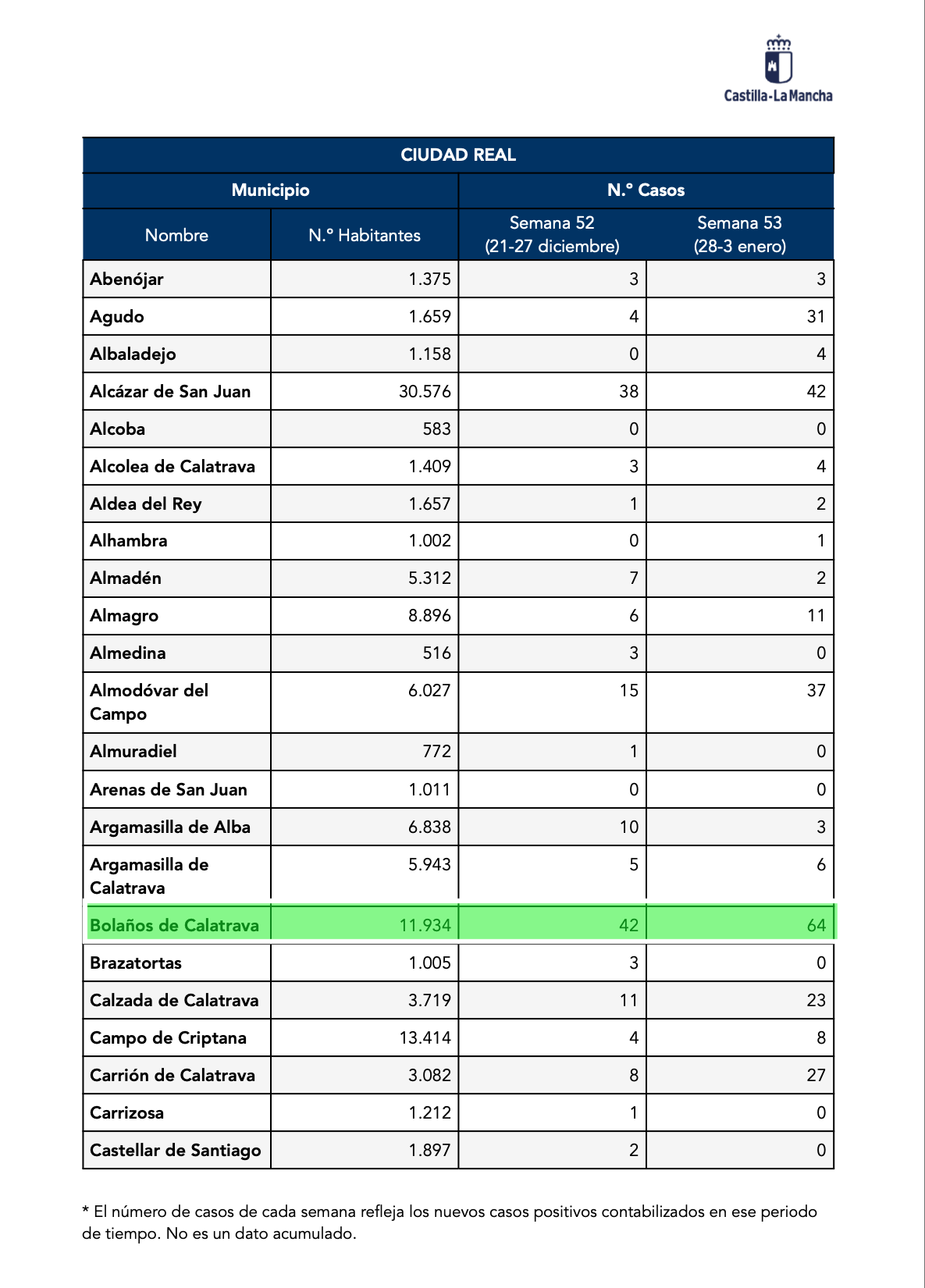 - Nuevos positivos en Bolaños de Calatrava en la semana 52: 42