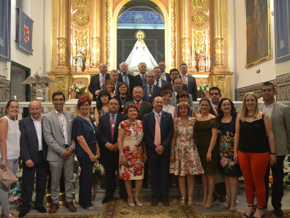 Isabel Padilla, Sagrario Vidal, María Engracia Cerro y Luis Barrios aceptaron el compromiso de trabajar por la Hermandad y por su Patrona que durante este fin de semana ha lucido vestido y manto- blanco, una gran mantilla de encaje de bolillos elaborado por almagreñas. A continuación, María Nieves Zamora Delgado ha recibido la medalla de hermana de la Virgen. La niña de 8 años de la localidad sevillana de Osuna lleva el nombre de Nieves por el fervor de su madre hacia la Patrona de Almagro que conoció hace años. Por este motivo, la Diputación, a petición de su familia, impuso la medalla a la pequeña en el día de ayer.