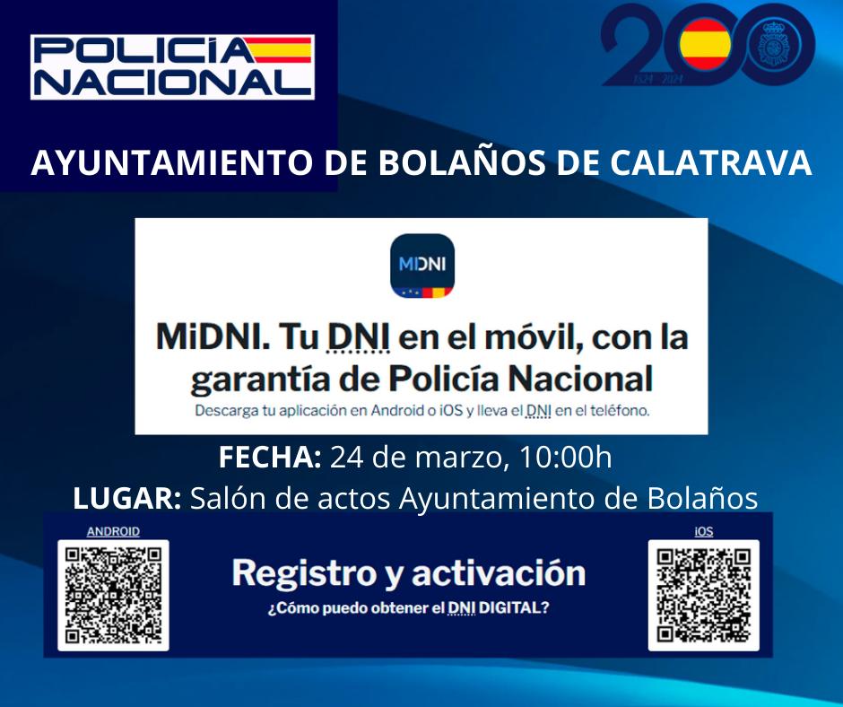 El Ayuntamiento de Bolaños de Calatrava acogerá el próximo martes, 24 de marzo, a las 10:00 horas, en el salón de actos municipal, una jornada informativa impartida por la Policía Nacional centrada en el nuevo DNI digital y la herramienta MiDNI, una propuesta de alto valor orientada a acercar la innovación tecnológica a la ciudadanía y al tejido profesional del municipio.