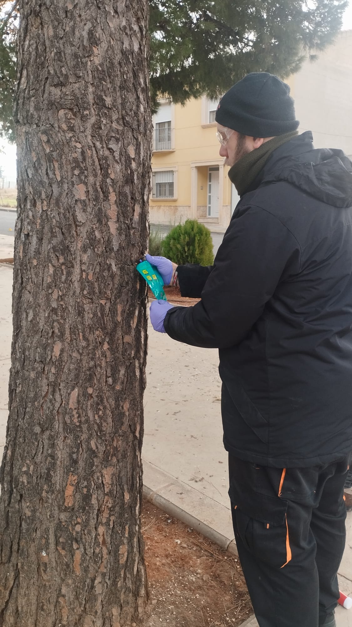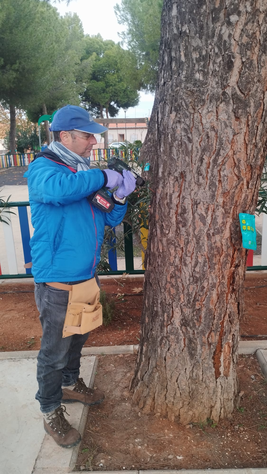 Tras numerosas reuniones y un trabajo conjunto entre los servicios municipales de jardinería, la Concejalía de Medio Ambiente y la empresa responsable del mantenimiento, se ha consensuado una nueva solución técnica: la aplicación de un tratamiento mediante endoterapia vegetal. Este sistema consiste en la inyección directa del producto en el tronco del pino, permitiendo que alcance la savia y proteja de manera integral a todo el árbol.